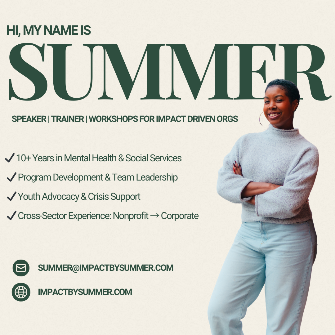 Book Summer Phillips to bring impact, energy, and grounded care to your next event. With over 10 years of experience in youth development, trauma-informed care, and community wellness, Summer delivers keynotes and talks that inspire action while offering real-world tools for growth.